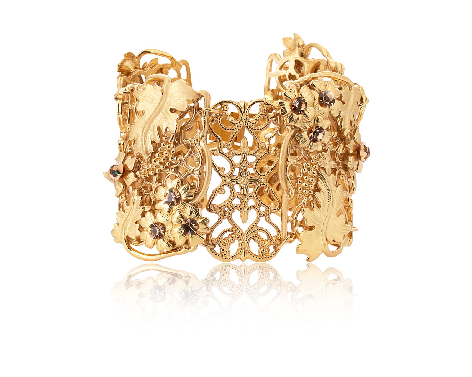 Pozłacana, ażurowa bransoletka z subtelnym motywem liści i kwiatów, zdobiona mieniącymi się kryształkami Preciosa to doskonały wybór dla osób ceniących romantyczny styl i wyrafinowane detale – piękny prezent dla siebie lub bliskiej osoby.