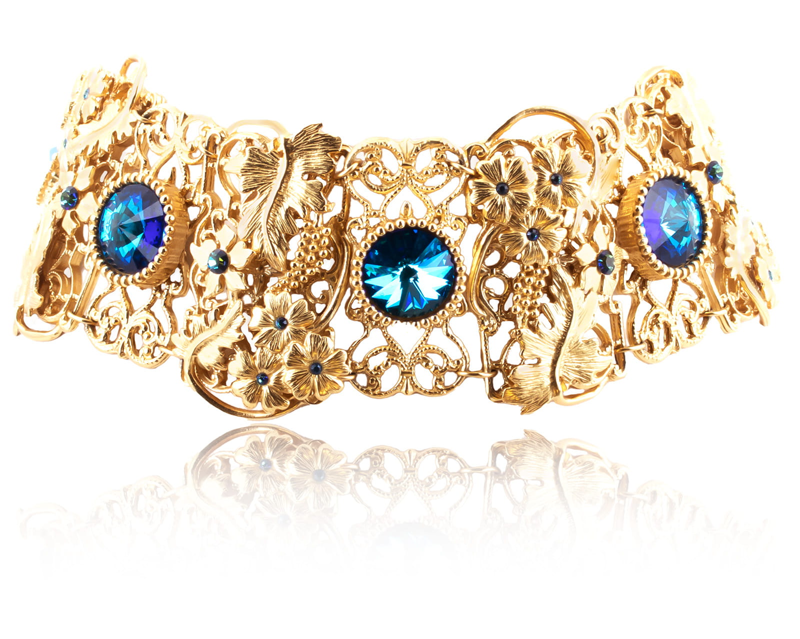 Kwiaty i liście zdobiące choker są precyzyjnie wykonane, a dzięki kryształom naszyjnik mieni się niebieskim blaskiem.