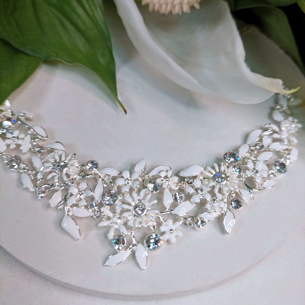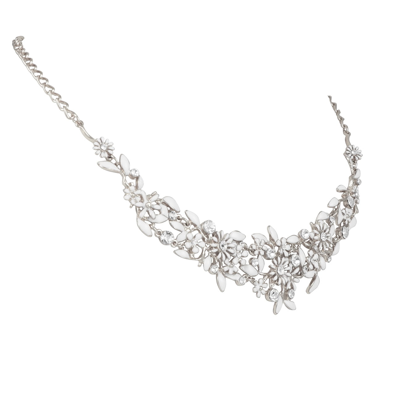 Posrebrzana, ręcznie robiona i zdobiona białą emalią oraz kryształkami Preciosa kolia z kwiatuszkami. Długość max. 46 cm, kolia regulowana.