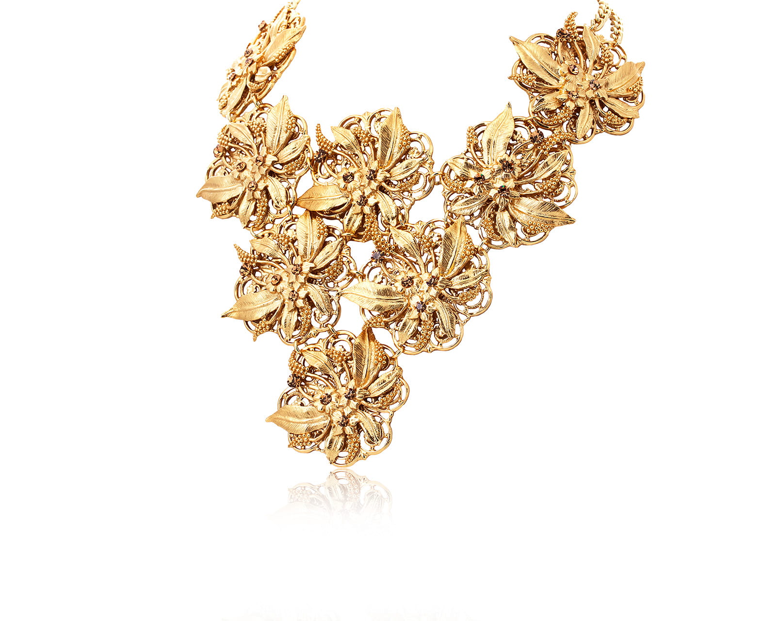 Bogata ozdoba wykonana z najwyższej jakości materiałów, przedstawia finezyjne kompozycje kwiatów i delikatnych liści, które tworzą efektowny i romantyczny naszyjnik.
